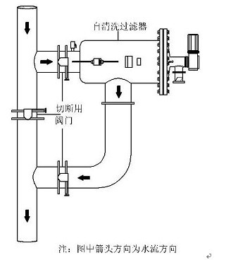 (6)安裝時(shí)應(yīng)考慮便于檢修,自清洗過(guò)濾器前后應(yīng)安裝關(guān)斷閥門,且應(yīng)安裝旁通管道。